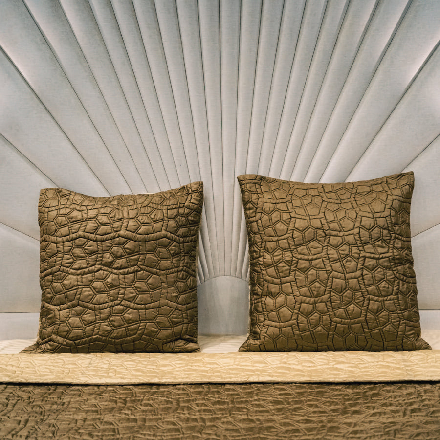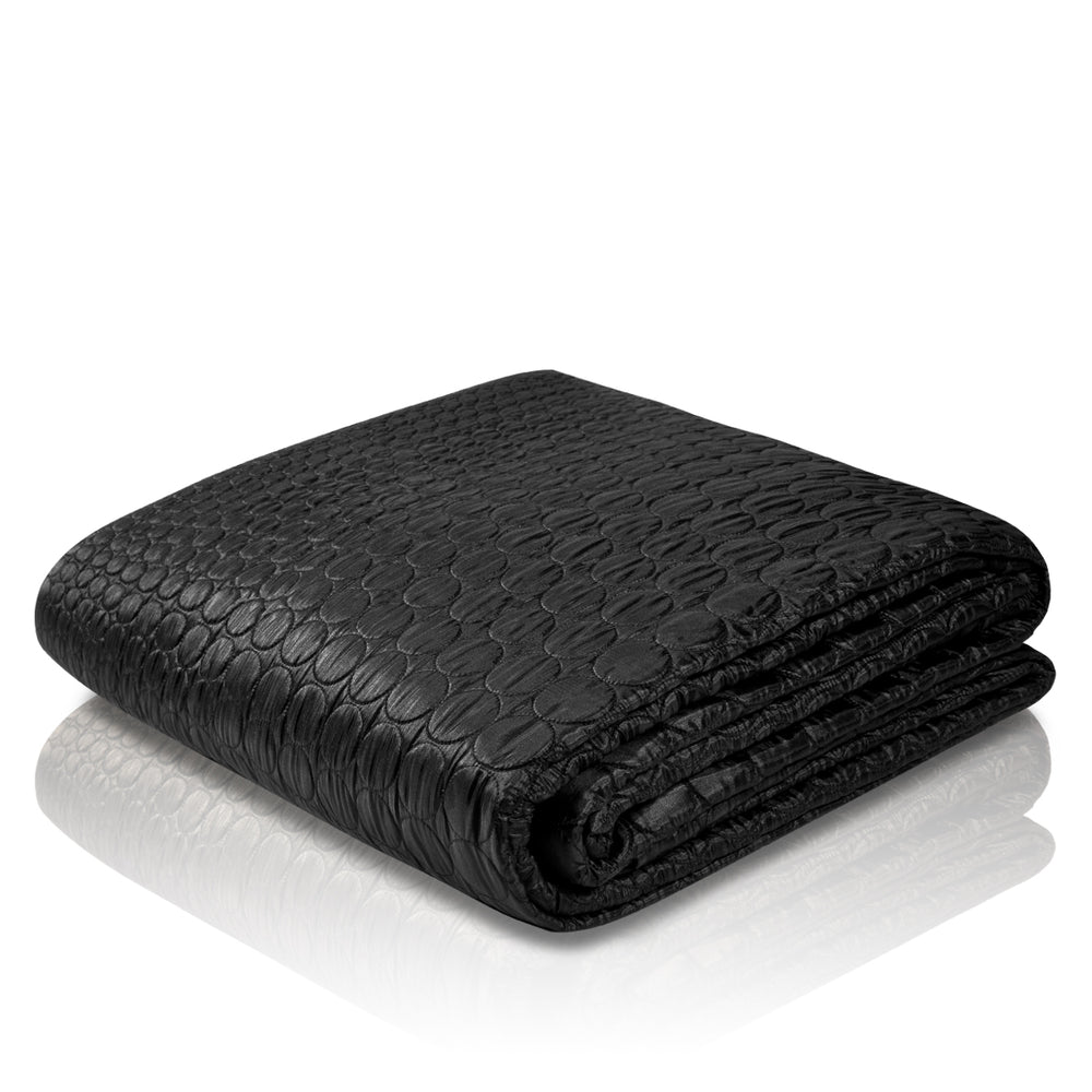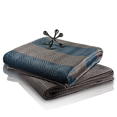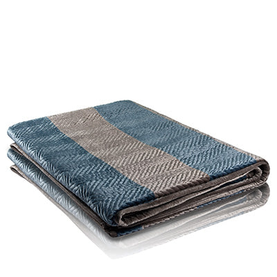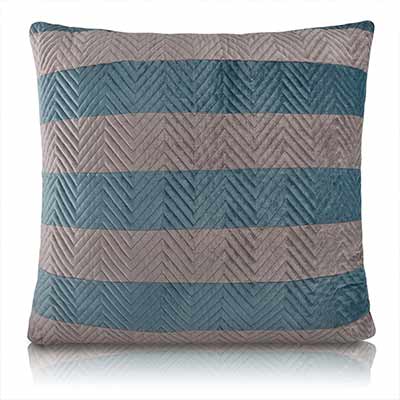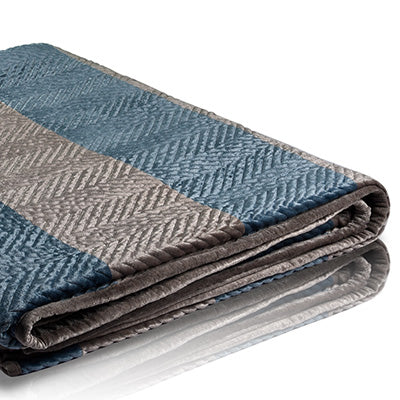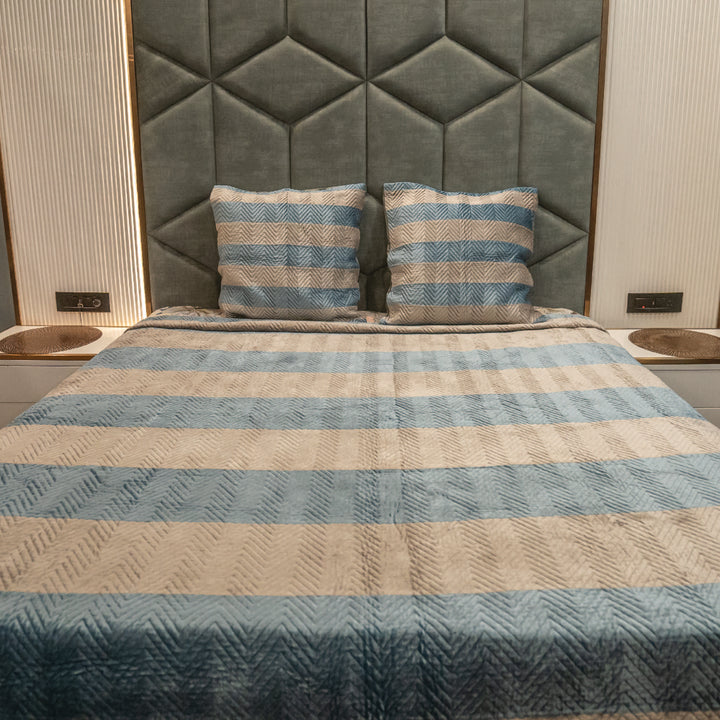 With an opulent faux silk back, this dreamy light blue and grey bedspread showcases stripes in lavish velvet patching. The clean chevron pattern is truly a treat for the eyes!