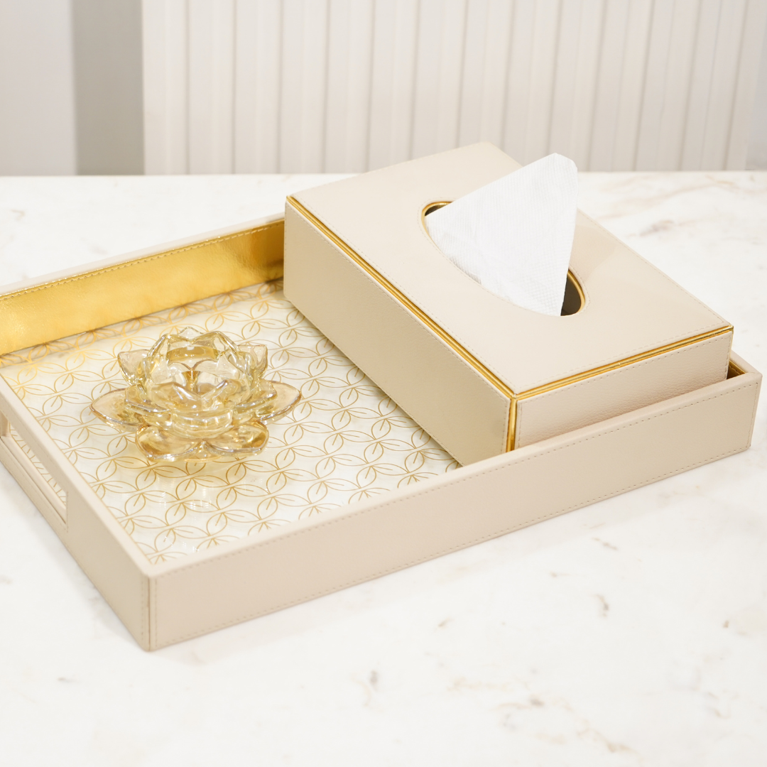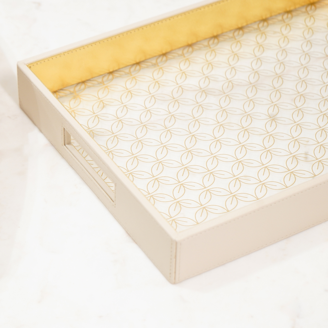 Vegan Leather Serving Tray w/ Beige & Gold Design