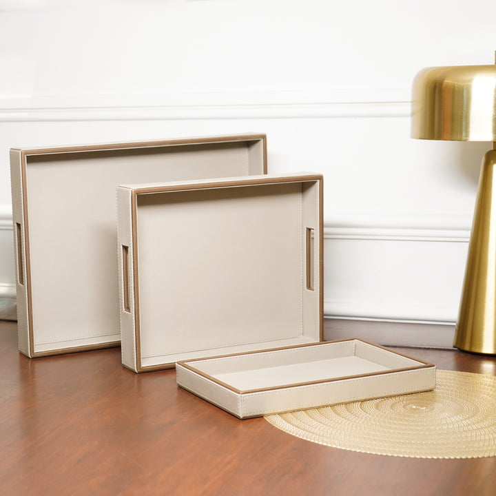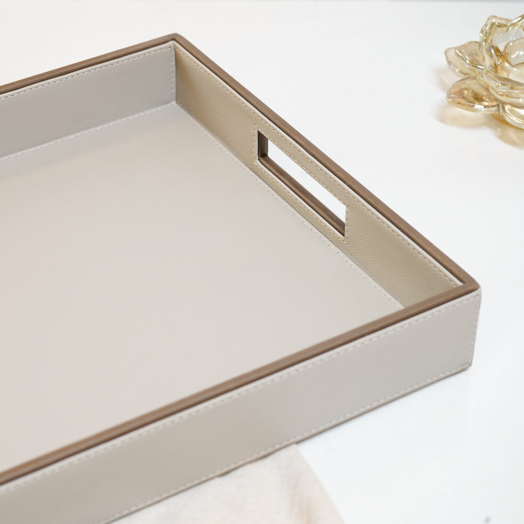 Elevate your home decor with the Suave Serving Tray in Beige colour. This tray is available in small, medium and large sizes. Make an ethical statement with the Cruelty-Free Faux Leather construction. Crafted without harming animals, this tray embodies responsible luxury, ensuring a guilt-free addition to your home. Perfect for Serving or Decorative Use, this tray effortlessly adapts to your needs. Serve snacks to guests with style or use it as a decorative piece to enhance the aesthetic appeal of your home.