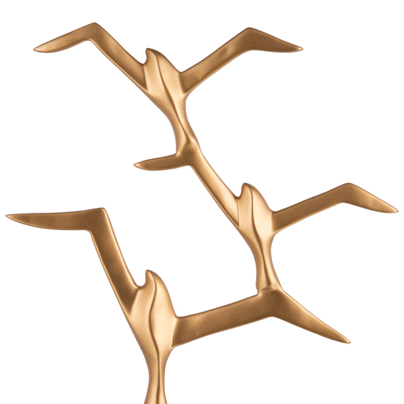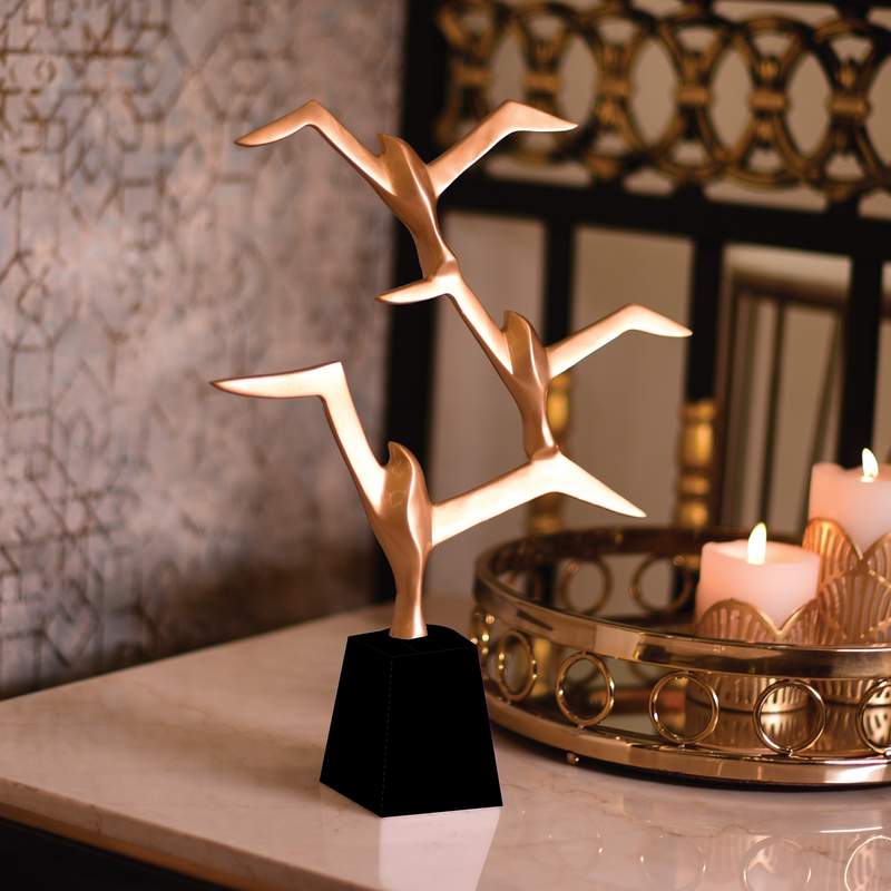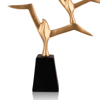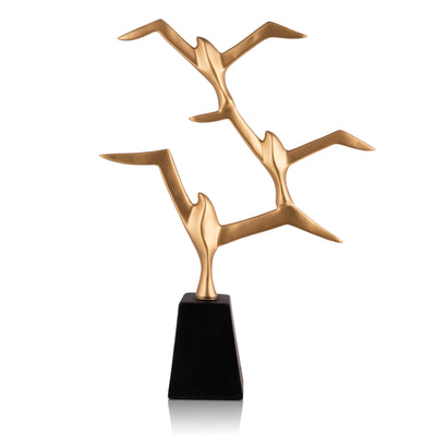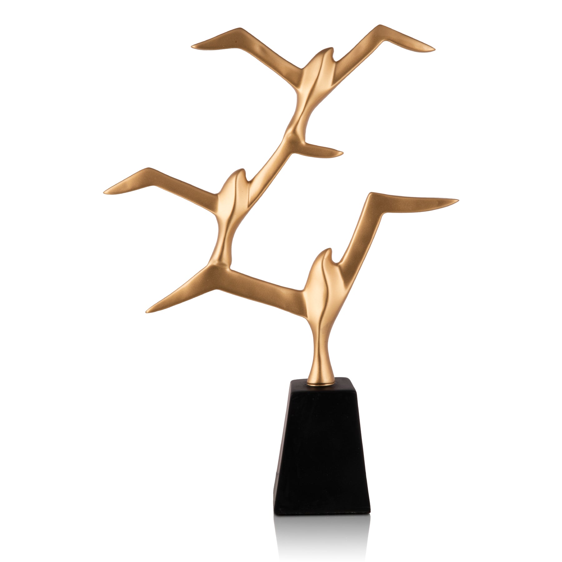 Experience the essence of graceful flight with our Flight of Elegance figurine, where three majestic birds poised for takeoff adorn a black base. Crafted with meticulous attention to detail, each bird gleams with a radiant golden hue, symbolizing freedom, beauty, and aspiration. The contrast between the luminous golden birds and the sleek white base creates a captivating visual harmony that is both striking and serene. Measuring 13 x 10 inches, this polyresin figurine exudes elegance and sophistication, making it a stunning centerpiece for any space. Elevate your decor with this exquisite piece that embodies the spirit of adventure and the beauty of nature.