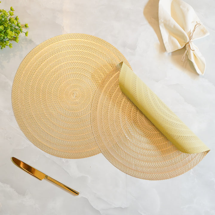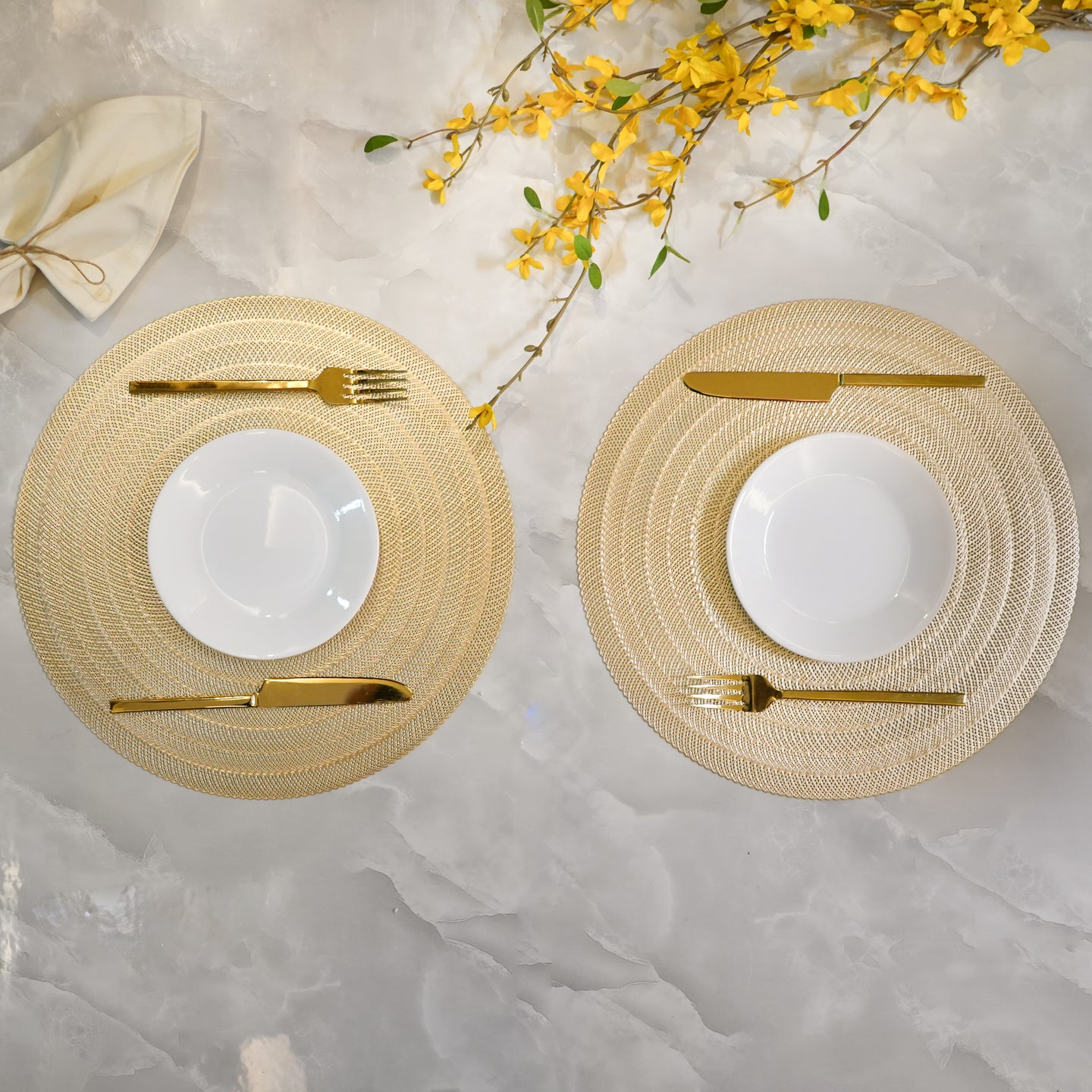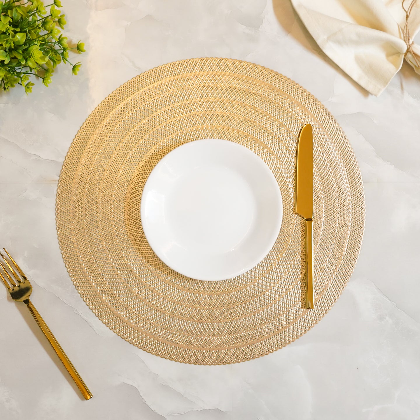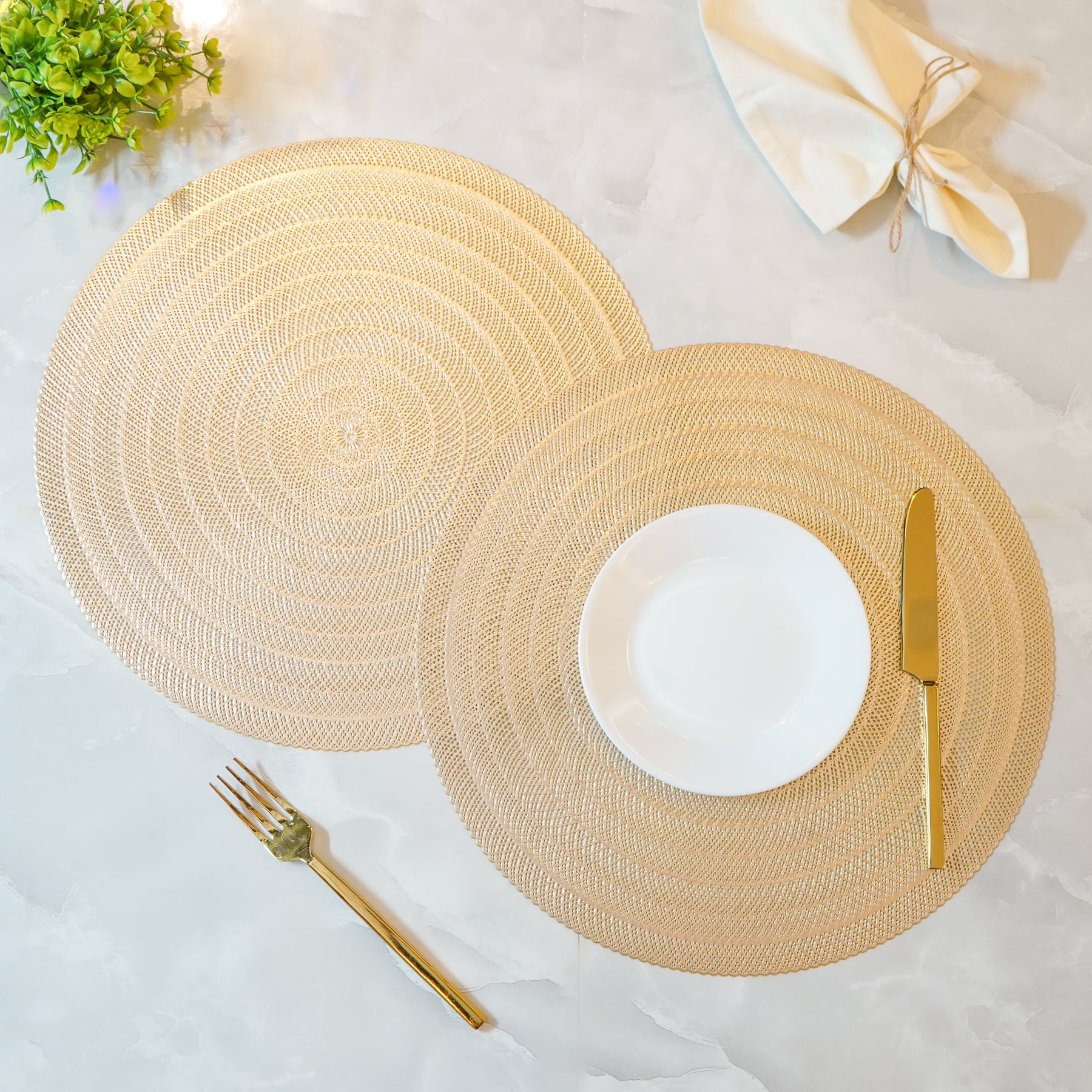 Enhance your dining setup with these sophisticated PVC placemats. Designed with a subtle mesh-like pattern, they bring a refined, modern aesthetic that complements any table decor. Each mat’s 38 cm diameter offers ample coverage, making them versatile for everyday meals or special occasions. Durable, easy-to-clean, and effortlessly stylish, this set is perfect for adding both function and understated elegance to your dining experience.