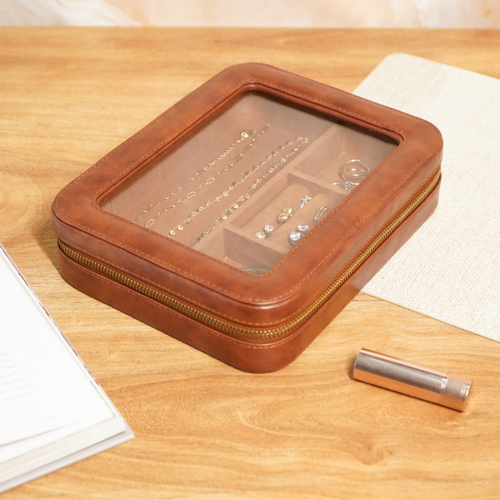 Vegan Leather Jewellery Travel Organiser Box, Brown