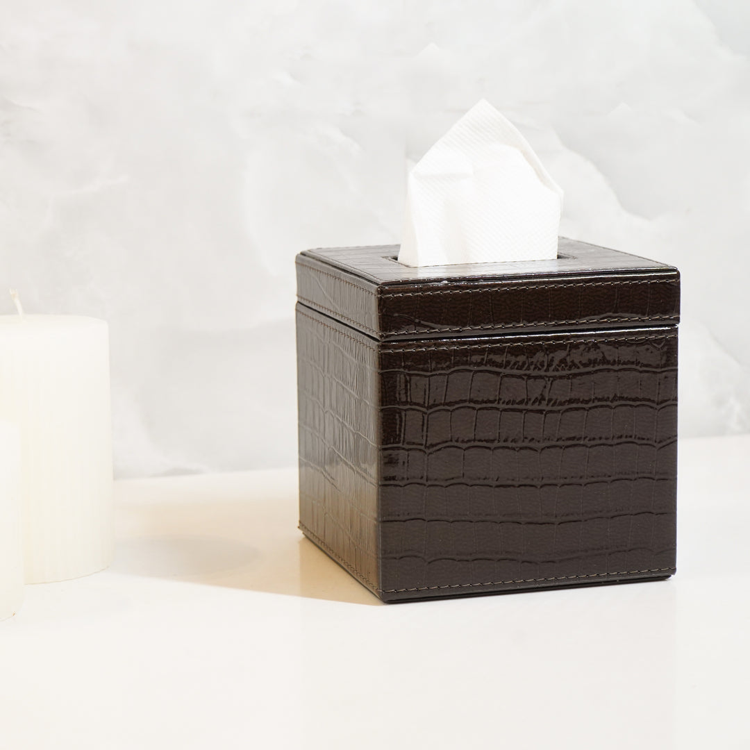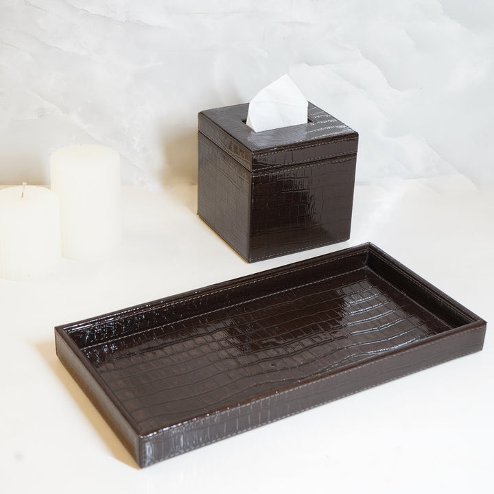 Upgrade your bathroom with our elegant faux leather bathroom organizer set, thoughtfully designed for both style and function. This chic collection features a sleek tray and tissue box in a modern new color and design, offering a sophisticated way to keep your space neat and organized. The luxurious faux leather finish complements any bathroom décor while providing practical storage for your essentials.