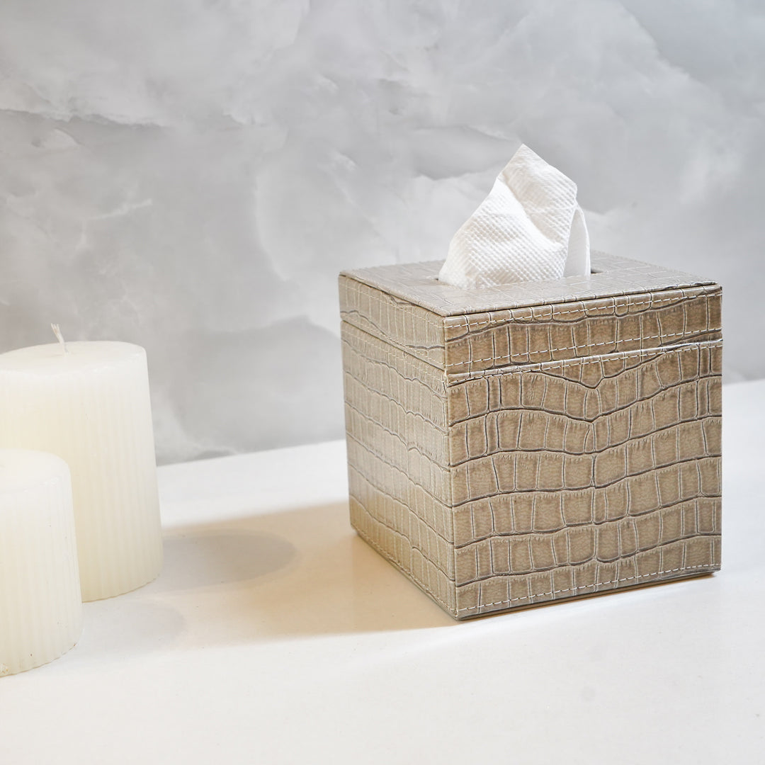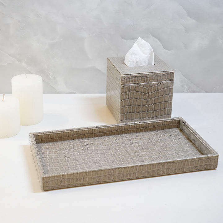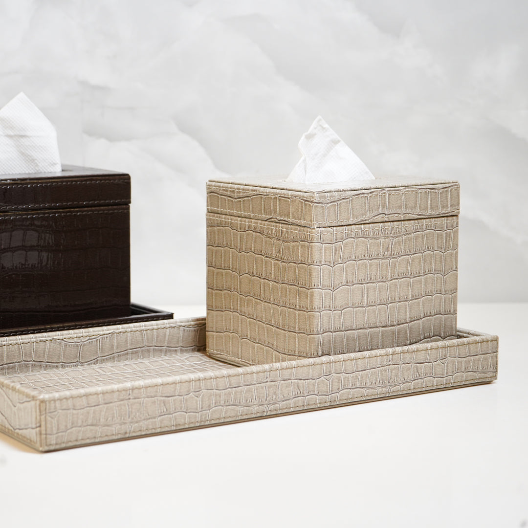 Upgrade your bathroom with our elegant faux leather bathroom organizer set, thoughtfully designed for both style and function. This chic collection features a sleek tray and tissue box in a modern new color and design, offering a sophisticated way to keep your space neat and organized. The luxurious faux leather finish complements any bathroom décor while providing practical storage for your essentials.