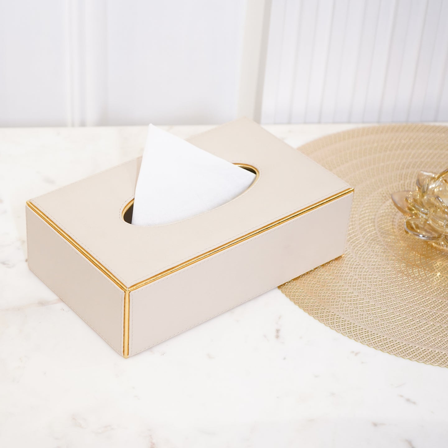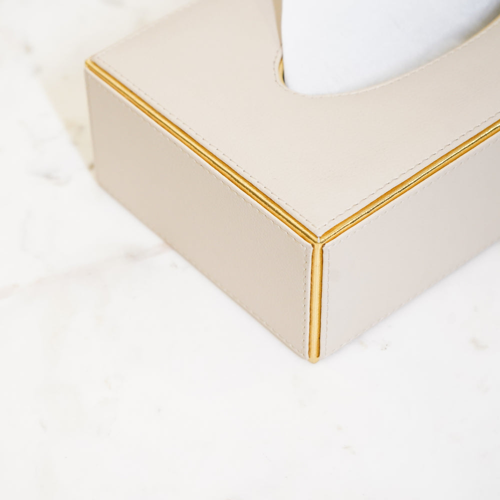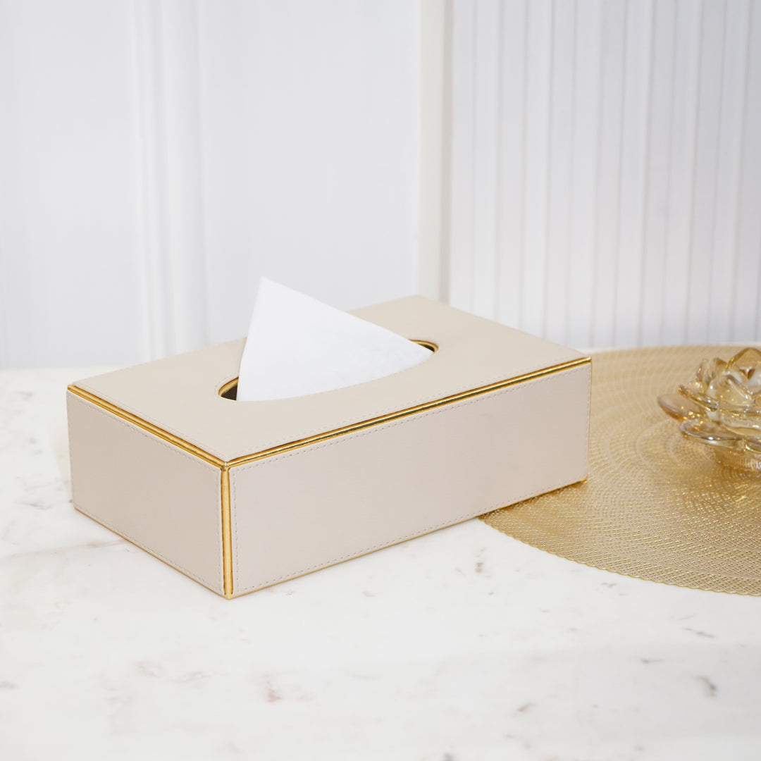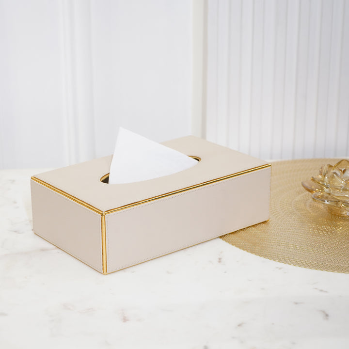 This sleek tissue box cover combines function and style, offering a sophisticated touch to any space. Made with high-quality beige faux leather and featuring gold highlights, it provides durability with a modern look, ideal for home, office, or commercial settings.