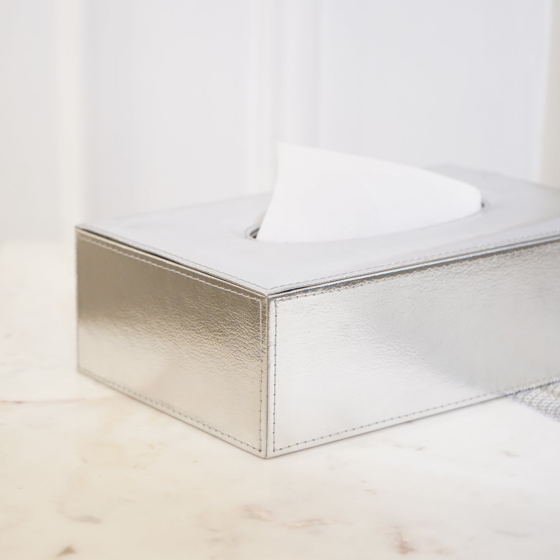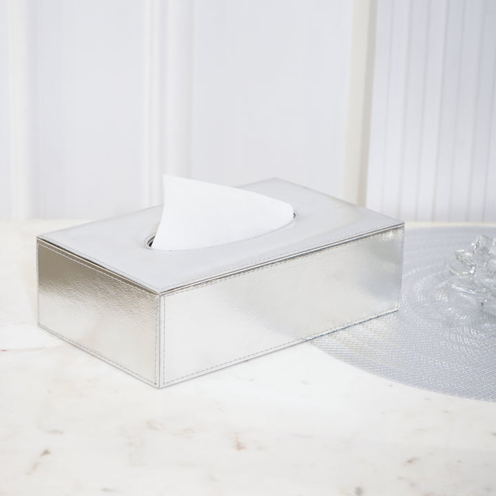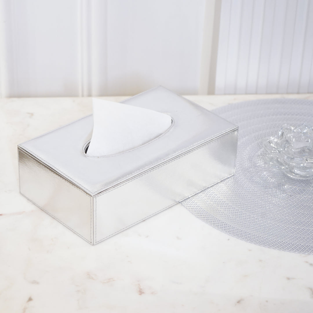 This sleek tissue box cover combines function and style, offering a sophisticated touch to any space. Made with high-quality silver faux leather, it provides durability with a modern look, ideal for home, office, or commercial settings.