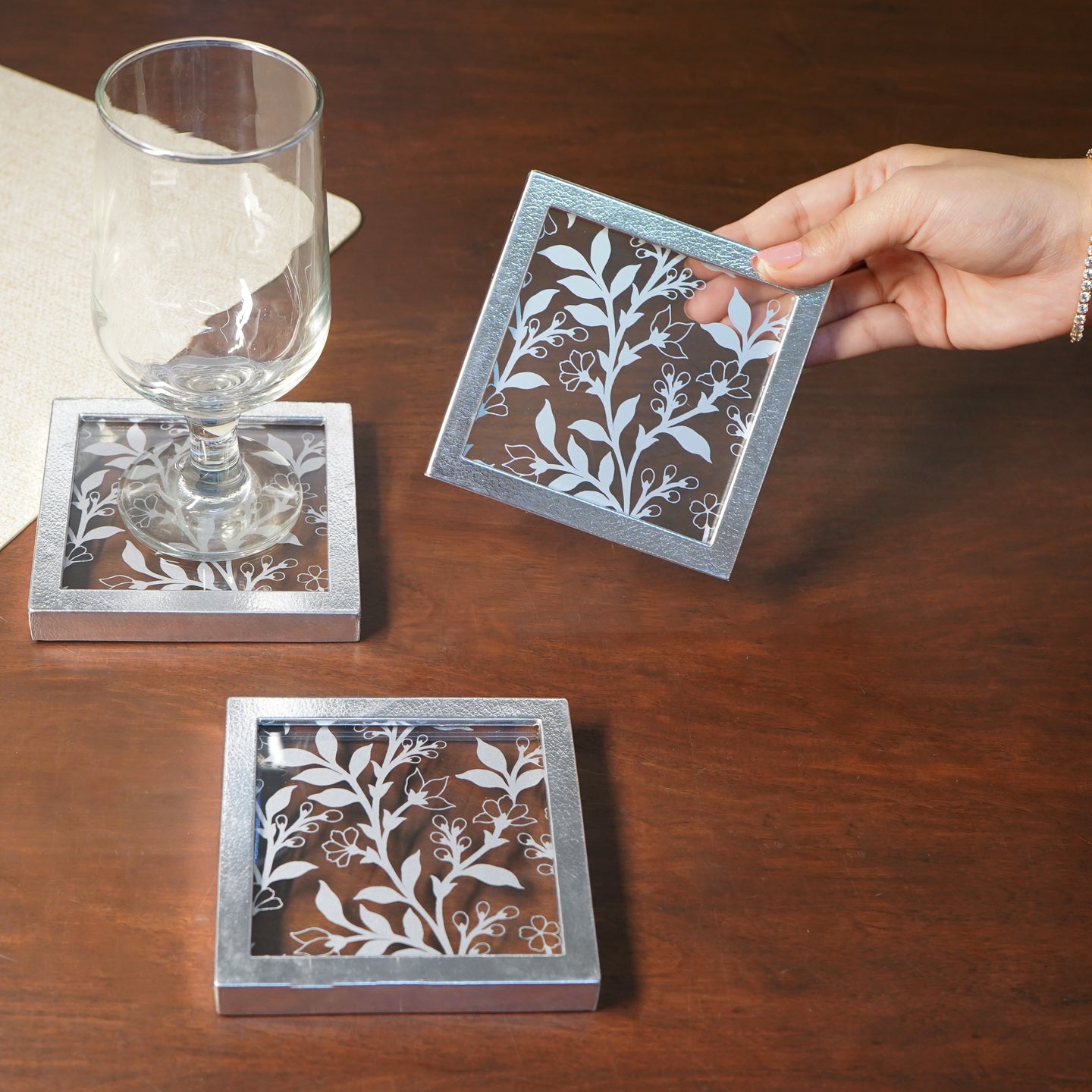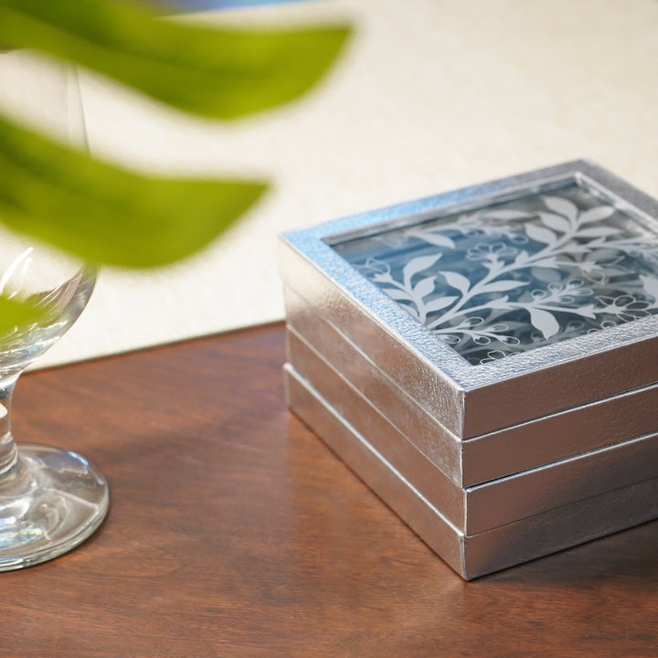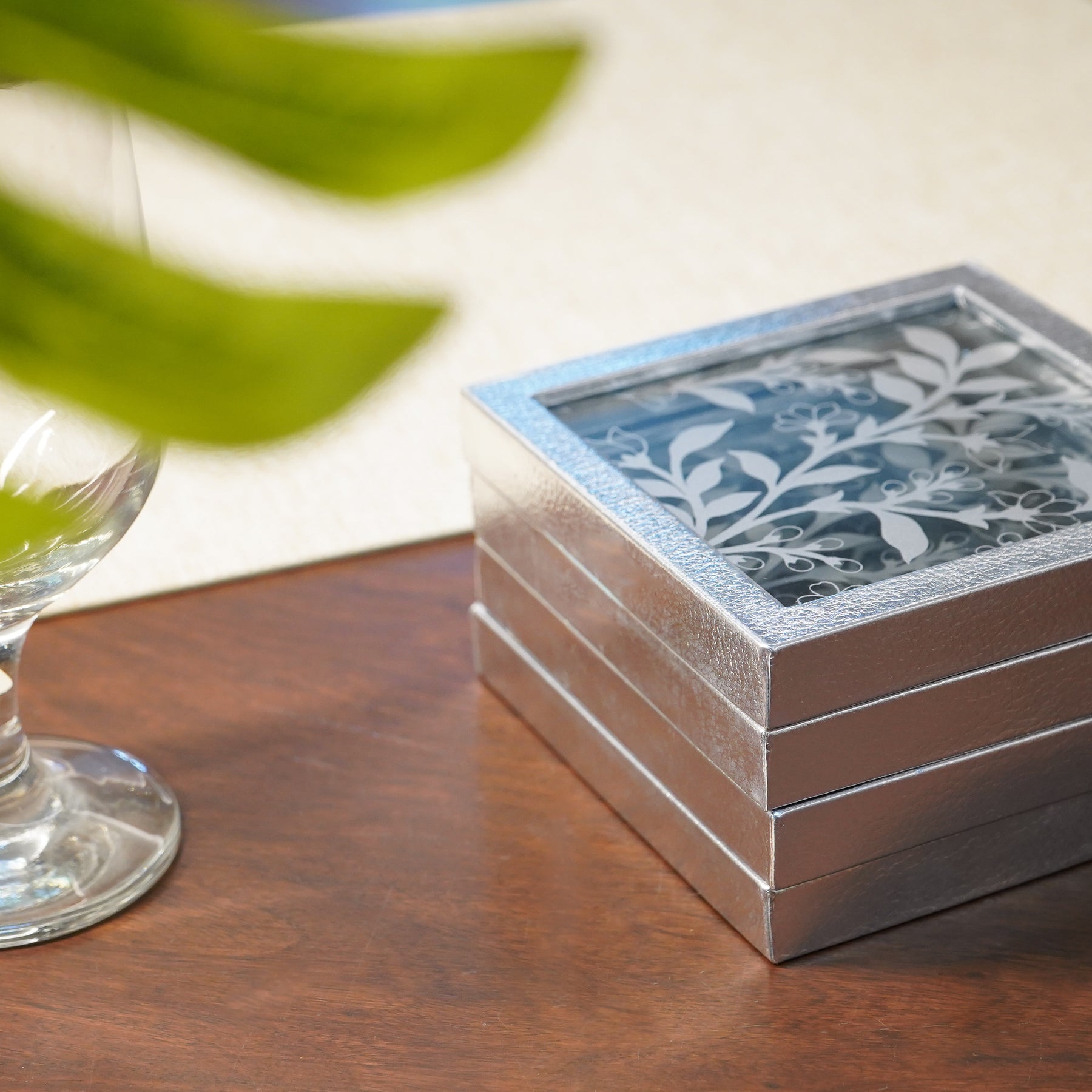 This elegant piece features a polished glass surface with an embossed glass finish, perfectly framed by a sleek faux leather silver border. The mirror’s gleam beautifully complements the soft sheen of the border, creating a stylish contrast that’s both modern and classic. Designed to protect your surfaces while elevating your decor, this coaster makes every beverage feel like a special occasion. Perfect for entertaining or everyday use, it's the ultimate blend of form and function.